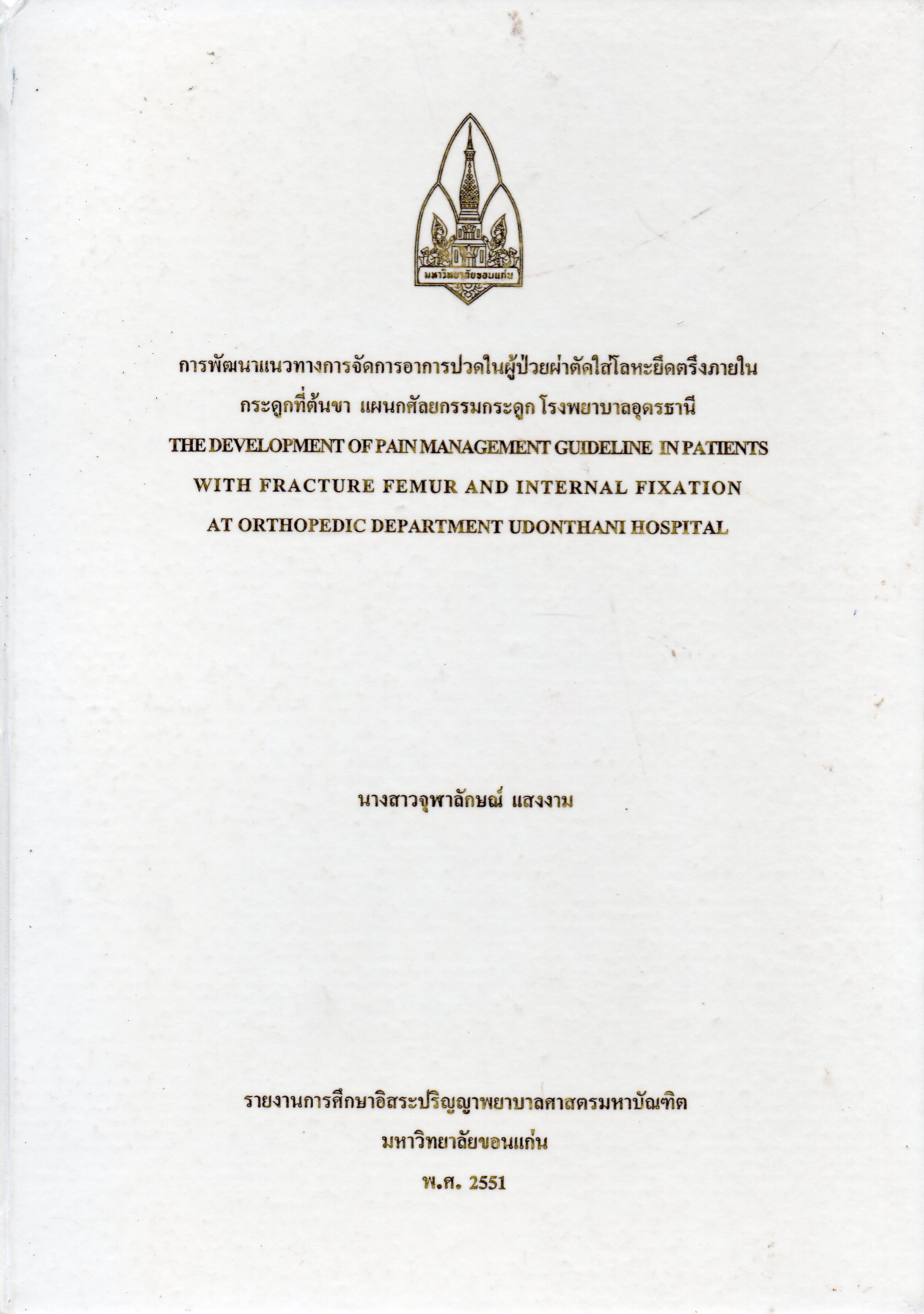 การพัฒนาแนวทางการจัดการอาการปวดในผู้ป่วยป่วยผ่าตัดใส่โลหะยึดตรึงภายในกระดูกที่ต้นขา แผนกศัลยกรรมกระดูกโรงพยาบาลอุดรธานี/ จุฬาลักษณ์ แสงงาม