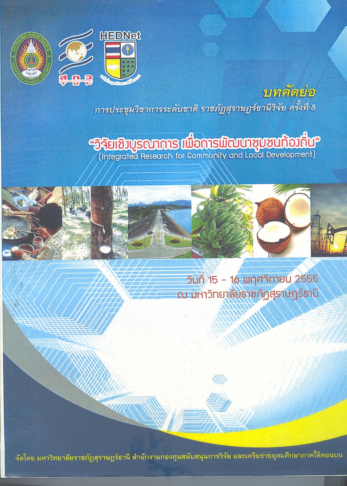 บทคัดย่อ การประชุมวิชาการระดับชาติ ราชภัฏสุราษฎร์ธานี ครั้งที่ 8 : "วิจัยเชิงบูรณาการเพื่อการพัฒนาชุมชนท้องถิ่น" (Integrated research for community and local development) วันที่ 15-16 พฤศจิกายน 2555 ณ มหาวิทยาลัยราชภัฏสุราษฎร์ธานี / จัดโดย มหาวิทยาลัยราชภัฏสุราษฎร์ธานี