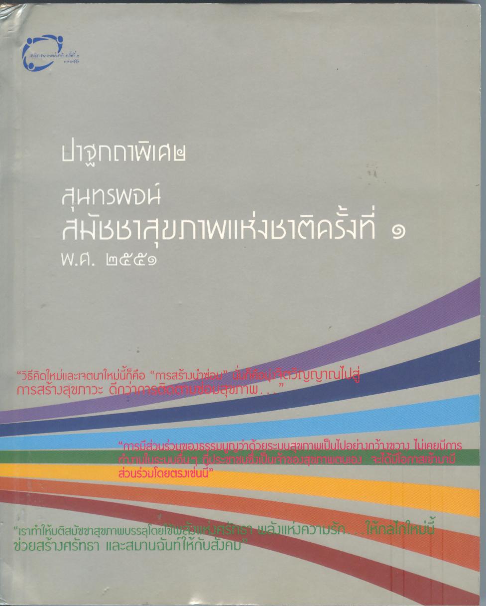 ปาฐกถาพิเศษและสุนทรพจน์สมัชชาสุขภาพแห่งชาติครั้งที่ 1 พ.ศ.2551" / ผู้รวบรวม นิรชา อัศวธีรากุล... [และคนอื่นๆ]