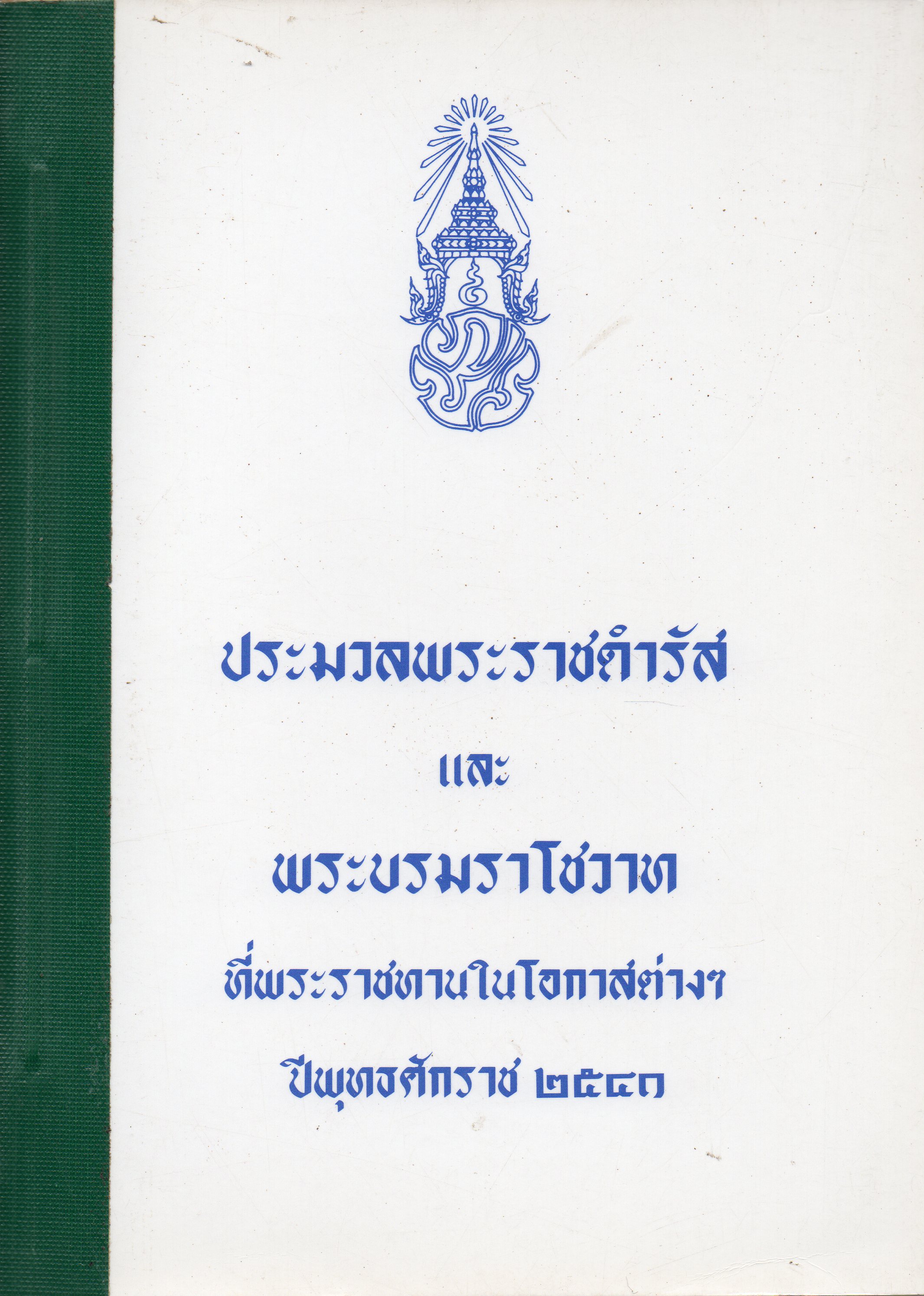 Contents: -- พระราชดำรัสในโอกาสต่างๆ -- พระราโชวาท สมเด็จพระบรมโอรสาธิราช ฯ สยามมกุฎราชกุมาร -- พระราโชวาท สมเด็จพระเทพรัตนราชสุดา ฯ สยามบรมราชกุมารี | | หัวเรื่อง |