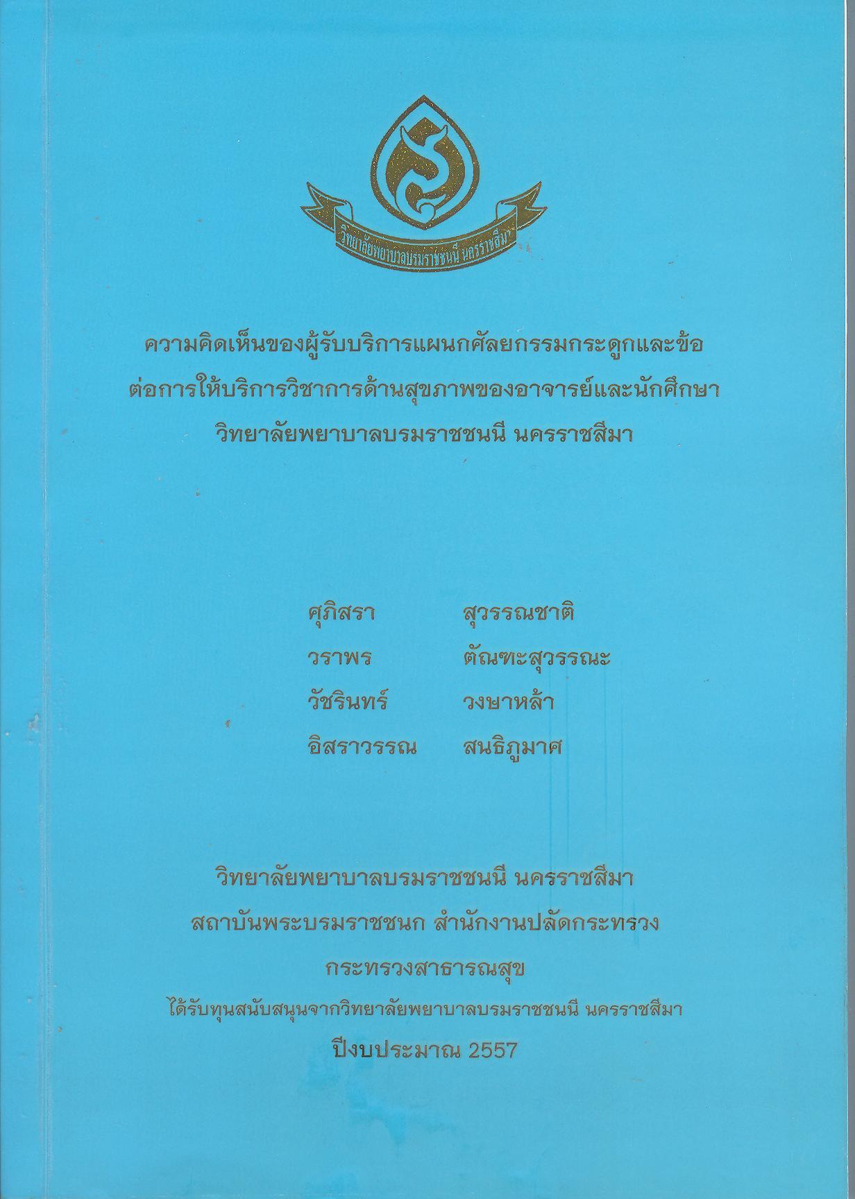 ความคิดเห็นของผู้รับบริการแผนกศัลยกรรมและกระดูกและข้อต่อการให้บริการวิชาการด้านสุขภาพของอาจารย์และนักศึกษา วิทยาลัยพยาบาลบรมราชชนนี นครราชสีมา/ ศุภิสรา สุวรรณชาติ, วราพร ตัณฑะสุวรรณะ, วัชรินทร์ วงษาหล้า และอิสราวรรณ สนธิภูมาศ
