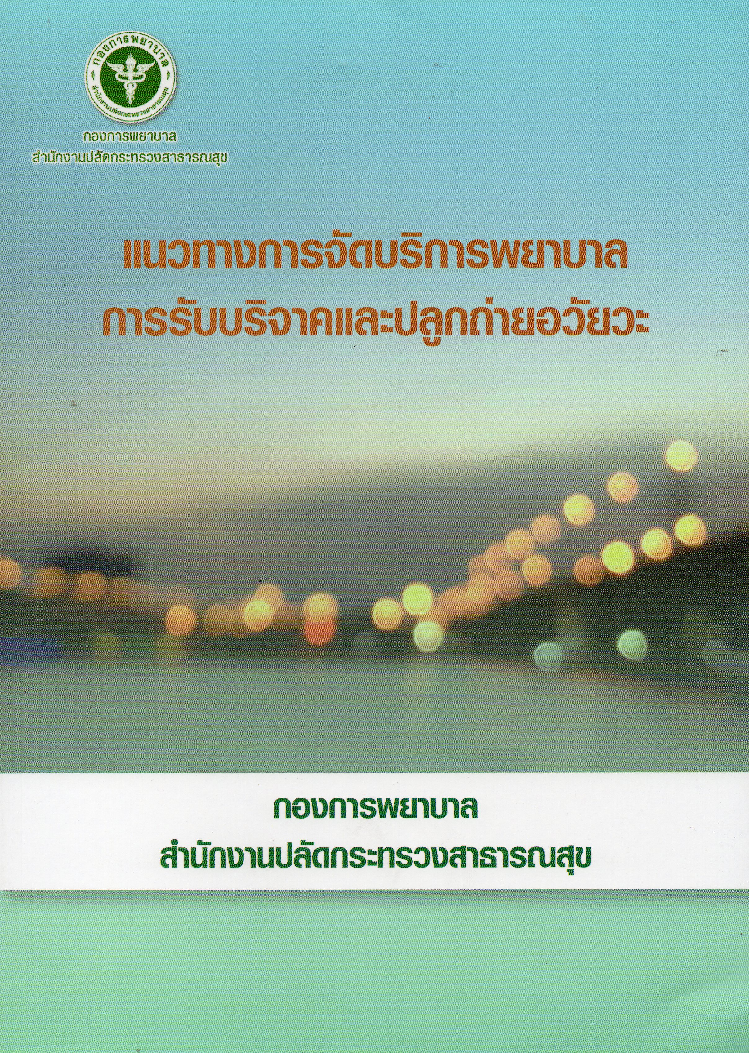 แนวทางการจัดบริการพยาบาลการรับบริจาคและปลูกถ่ายอวัยวะ / กองการพยาบาล สำนักงานปลัดกระทรวงสาธารณสุข ; บรรณาธิการ พัชรี เนียมศรี และศิริมา ลีละวงศ์ ; คณะผู้จัดทำ พัชรี เนียมศรี ... [และคนอื่นๆ] |
