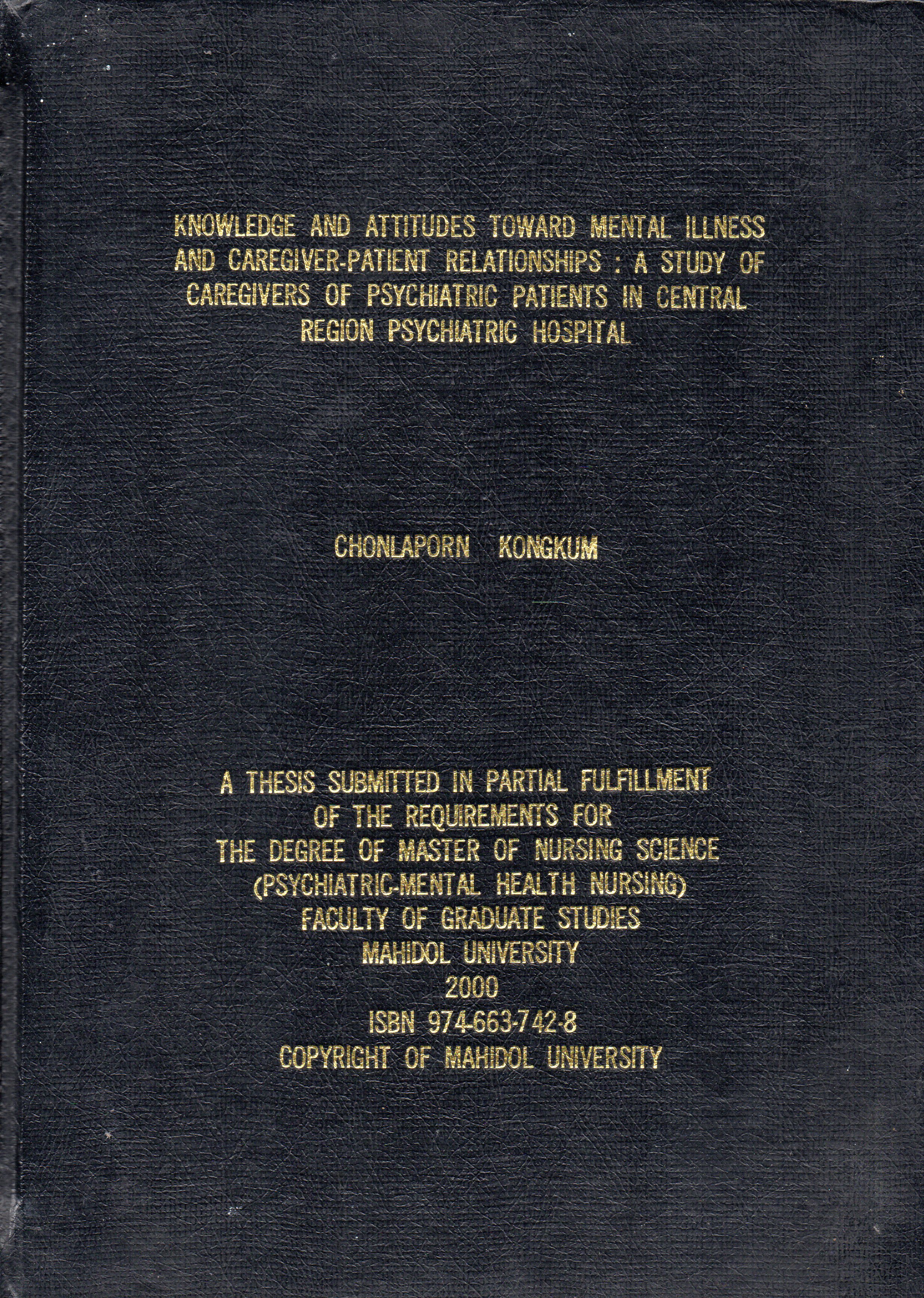 Knowladge and Attitudes Toward Mental illness and Caregiver Patient Relationships : A Study of Caregivers of Psychiatric patients in Central Region Psychiatric Hospital/ Chonlaporn Kongkum